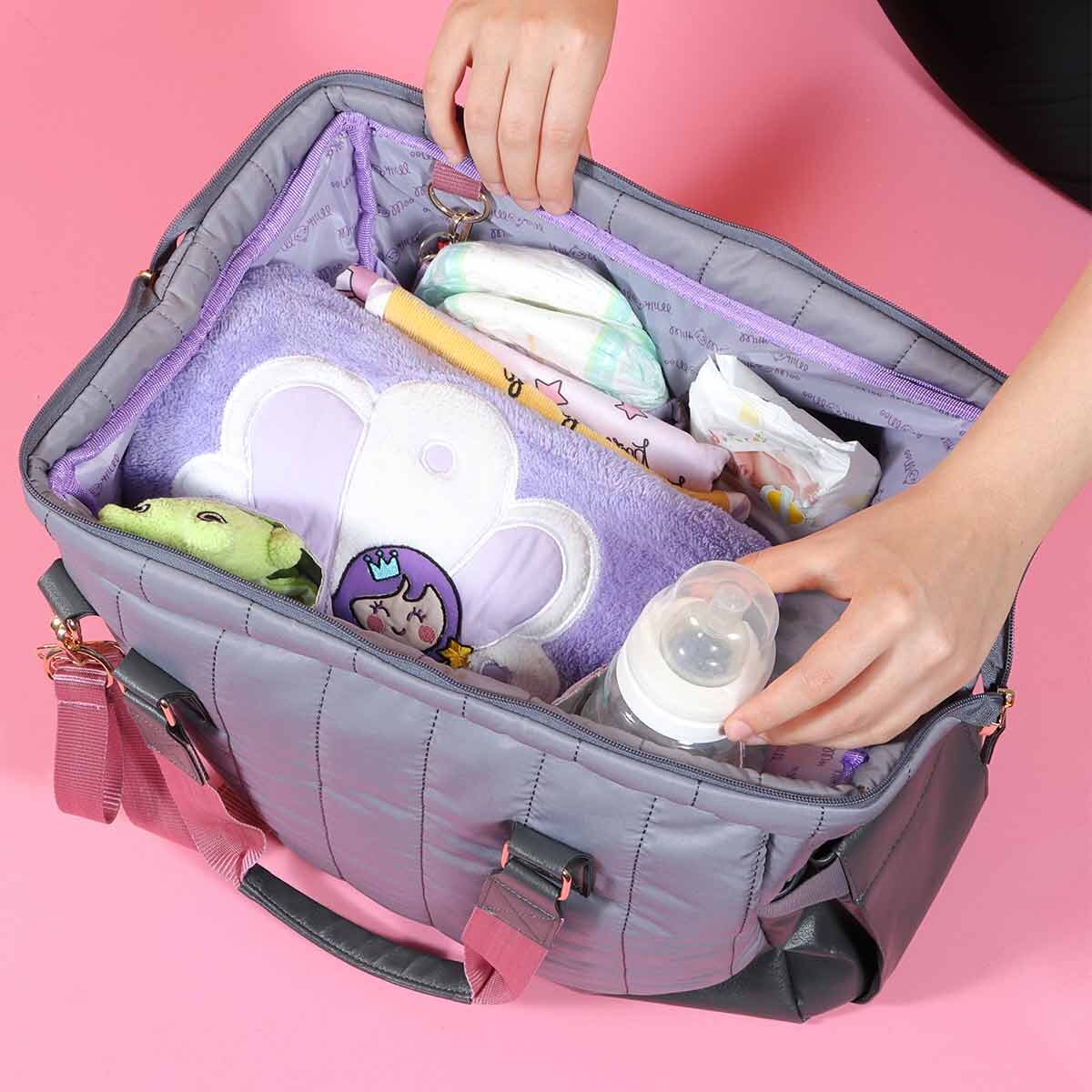 Milk&Moo Tote Diaper bags are designed to accommodate mothers’ comfort and mobility. The wide and double zipper opening provides an easy-to-organize baby care bag. This timeless quilted dark gray bag has a very wide usage area. It can be used as a hospital bag, diaper bag, travel bag, gym bag and even as a daily accessory. It makes a functional and gracious baby shower gift. The tote bag has changeable straps so it can be used as a messenger bag, shoulder bag and it can also be attached to a stroller.